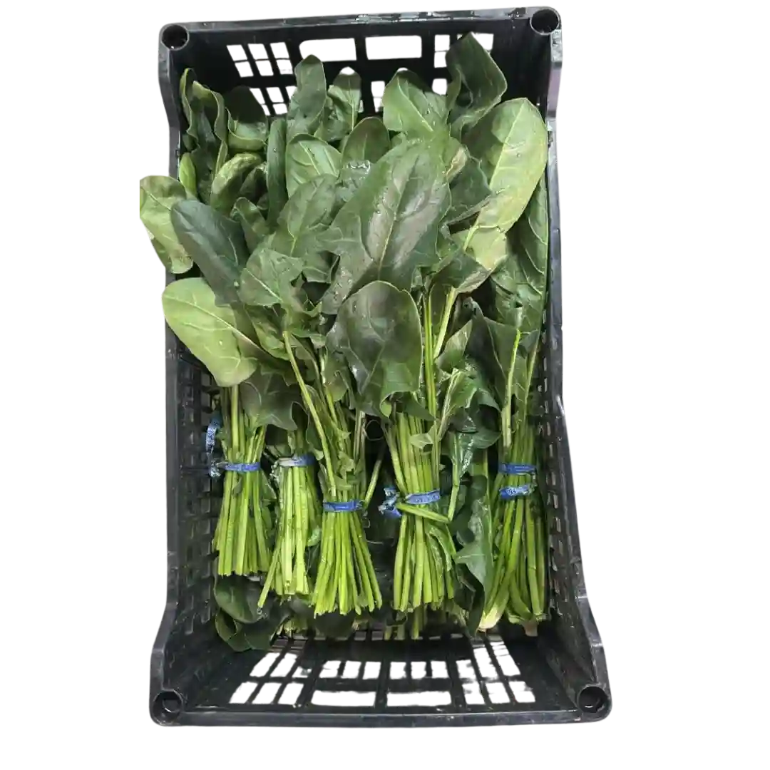 Espinaca cosechada cuidadosamente y atada en manojos. Sus hojas verdes y textura tierna la convierten en una excelente opción para jugos, ensaladas y cocina saludable. Ideal para consumidores que buscan nutrición y frescura.